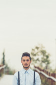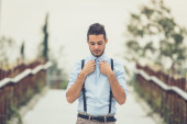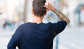 Widok z tyłu młodego człowieka, pozowanie na ulicach miasta