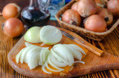 Cebula pocięta na pół pierścienia na stole kuchennym. Kawałki świeżej cebuli.