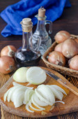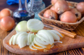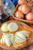 Cebula pocięta na pół pierścienia na stole kuchennym. Kawałki świeżej cebuli.