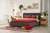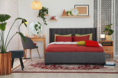 Stylowe wnętrze sypialni z wygodnym łóżkiem i zielonymi roślinami