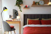 Zdjęcie "Stylowe wnętrze sypialni z wygodnym łóżkiem i zielonymi roślinami" może być wykorzystywane do celów osobistych i komercyjnych zgodnie z warunkami zakupionej licencji Royalty-free. Obraz jest dostępny do pobrania w jakości wysokiej rozdzielczości do 5760x3840.