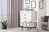 Stylowy salon z drewnianą skrzynią szuflad, roślin doniczkowych i piękny obraz. Projekt wnętrza