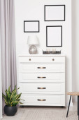 Zdjęcie "Stylowy salon z drewnianą skrzynią szuflad, roślin doniczkowych i piękny obraz. Projekt wnętrza" może być wykorzystywane do celów osobistych i komercyjnych zgodnie z warunkami zakupionej licencji Royalty-free. Obraz jest dostępny do pobrania w jakości wysokiej rozdzielczości do 5760x3840.