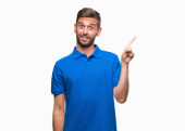 Szczęśliwy człowiek pokazuje swój język i wskazuje na coś na białym tle