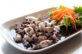 smażony piasek witlinek ryby z czosnkiem na talerzu. Owoce morza tajskiego