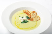 Klasyczna zupa cebulowa z serem gruyere i tostową bagietką w misce