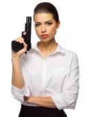 Zdjęcie "Młody businewoman z pistoletu" może być wykorzystywane do celów osobistych i komercyjnych zgodnie z warunkami zakupionej licencji Royalty-free. Obraz jest dostępny do pobrania w jakości wysokiej rozdzielczości do 5760x3840.