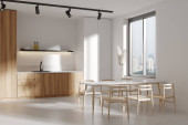 Zdjęcie "Widok z przodu na nowoczesne jasne wnętrze pokoju kuchnia z jadalnią, okno z widokiem na miasto, krzesła, białe ściany, betonowa podłoga, lodówka, naczynia, piekarnik. Koncepcja minimalistycznego designu. 3d renderowanie" może być wykorzystywane do celów osobistych i komercyjnych zgodnie z warunkami zakupionej licencji Royalty-free. Obraz jest dostępny do pobrania w jakości wysokiej rozdzielczości do 5760x3840.