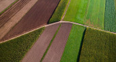 Kolorowe pola uprawne i malownicza okolica. Widok drona lotniczego