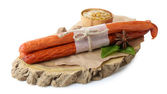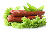 wędzone kiełbasy cienkie z sałata sałatka z liści na deski do krojenia drewniana, na białym tle