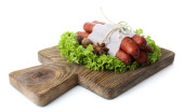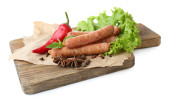 wędzone kiełbasy cienkie z sałata sałatka z liści na deski do krojenia drewniana, na białym tle