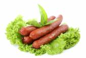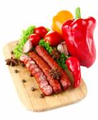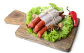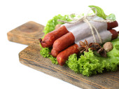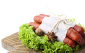 wędzone kiełbasy cienkie z sałata sałatka z liści na deski do krojenia drewniana, na białym tle