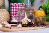 Wędzone kiełbasy cienkie, musztarda w misce i przyprawy na deski do krojenia, na tle drewniane