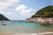 Bermeo port i widok na osadę, Hiszpania. Krajobraz hiszpański