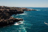 Klify krajobrazu plaży Aviles, Asturias, Hiszpania. Panorama wybrzeża Hiszpanii