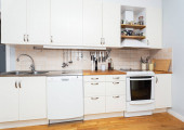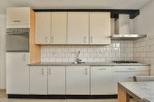 kuchnia z białymi szafkami i sprzętem na blacie przed kuchenką, która służy do gotowania