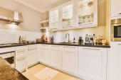 Zdjęcie "kuchnia z białymi szafkami i sprzętem na blacie przed kuchenką, która służy do gotowania" może być wykorzystywane do celów osobistych i komercyjnych zgodnie z warunkami zakupionej licencji Royalty-free. Obraz jest dostępny do pobrania w jakości wysokiej rozdzielczości do 5760x3840.