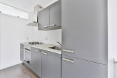 nowoczesna kuchnia z podłogi drewnianej i urządzeń ze stali nierdzewnej na licznikach w tym apartamentach kuchnia