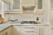 Zdjęcie "nowoczesna kuchnia z podłogi drewnianej i urządzeń ze stali nierdzewnej na licznikach w tym apartamentach kuchnia" może być wykorzystywane do celów osobistych i komercyjnych zgodnie z warunkami zakupionej licencji Royalty-free. Obraz jest dostępny do pobrania w jakości wysokiej rozdzielczości do 5760x3840.