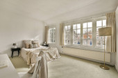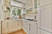 kuchnia z drewnianą podłogą i szafkami z białymi szafkami po obu stronach okna z widokiem na ulicę