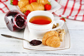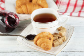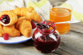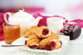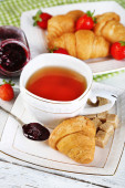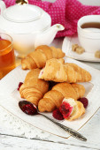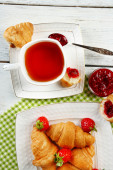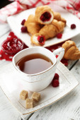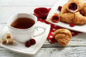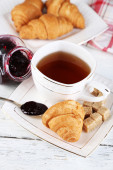 Śniadanie z herbata, dżem i świeże rogaliki na drewniane tła