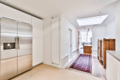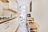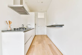 Zdjęcie "wnętrze kuchni z drewnianą podłogą i białymi szafkami po obu stronach drzwi do pokoju" może być wykorzystywane do celów osobistych i komercyjnych zgodnie z warunkami zakupionej licencji Royalty-free. Obraz jest dostępny do pobrania w jakości wysokiej rozdzielczości do 5760x3840.