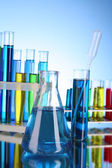 Szkło z środka chemicznego na biurku, na tle zielonej tablicy