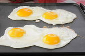 jajecznica z 2 jaj kurzych w czarnej tabliczce na szarym stole
