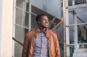 Młody Afrykanin rozmawiający przez telefon zszokowany, zestresowany. Portret uliczny, przestrzeń do kopiowania