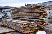 Kupa drewnianych desek na placu budowy. Drewniane deski, drewno. Drewno o krawędziach przemysłowych. Drewniane krokwie do naprawy lub budowy prywatnego domu. Drewno dachowe i stolarskie
