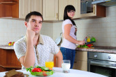 Senny para ma śniadanie w kuchni