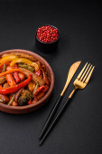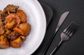 Pyszny gulasz z ziemniakami, pomidorami, wołowiną, cebulą i marchewką na ceramicznym talerzu na ciemnym betonowym tle