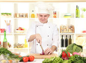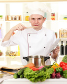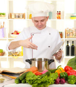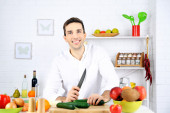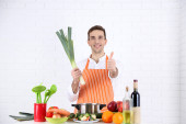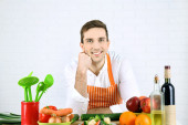 Człowiek z receptury dokonać rezerwacji w ręce przy stole z różnych produktów i szkło w kuchni na tle białej ściany