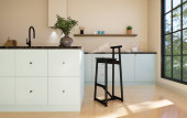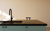 Nowoczesna przestronna, jasna kuchnia z nasłonecznieniem i ciemnymi akcentami. Renderowanie 3D. Ciemny kran kuchenny i ciemny blat w jasnej kuchni.