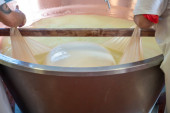 przechowywanie i podgrzewanie mleka organicznego wlanego do kotłów miedzianych, dzięki czemu ser parmigiano reggiano w zakładzie produkcji szachów tradycyjny włoski przepis