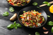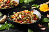 Zdjęcie "Usmaż chrupiącą wołowinę pomarańczową ze słodką papryką, cebulą i ryżem. Żywność azjatycka." może być wykorzystywane do celów osobistych i komercyjnych zgodnie z warunkami zakupionej licencji Royalty-free. Obraz jest dostępny do pobrania w jakości wysokiej rozdzielczości do 5760x3840.