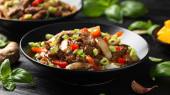 Usmaż chrupiącą wołowinę pomarańczową ze słodką papryką, cebulą i ryżem. Żywność azjatycka.