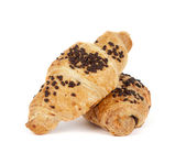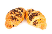 Świeże i smaczne rogaliki z czekolada na Deska drewniana, na białym tle