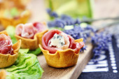 Pyszne bruschetta brzoskwiniowa prosciutto, crostini z serem śmietankowym, liść bazylii, brzoskwinia zawinięta w prosciutto, zwieńczona miodem, pozioma, zbliżenie
