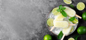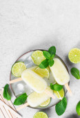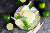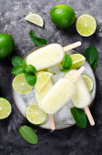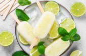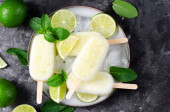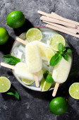 Orzeźwiające limonkowe lody, brazylijska cytrynowa Lolly lodowa ze świeżym wapnem i miętą na jasnym tle, zdrowy deser