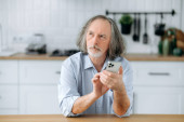 Zdjęcie "Pozytywny dojrzały siwowłosy biały mężczyzna siedzi w kuchni przy stole z laptopem, trzyma dokumenty w rękach, wykonuje papierkową robotę, godzi dane, analizuje wyniki pracy" może być wykorzystywane do celów osobistych i komercyjnych zgodnie z warunkami zakupionej licencji Royalty-free. Obraz jest dostępny do pobrania w jakości wysokiej rozdzielczości do 5760x3840.