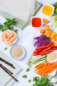 Robię pyszne sajgonki. Kobieta owija świeże warzywa w papier ryżowy przy białym drewnianym stole, widok z góry