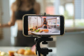 Młoda blogerka rejestrująca treści wideo na temat prawidłowego odżywiania i dietetyki. Vlogging i koncepcja zdrowego stylu życia.
