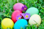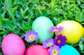 Kolorowe pisanki na zielonej trawie