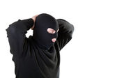 Widok człowieka w czarna maska trzyma ręce nad szary z tyłu