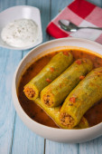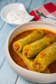 Przepis nadziewane cukinia z sosem pomidorowym, Libański styl, Kouca Mehchi bi Banadoura, z greckim jogurtem. Wysokiej jakości zdjęcie