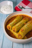 Zdjęcie "Przepis nadziewane cukinia z sosem pomidorowym, Libański styl, Kouca Mehchi bi Banadoura, z greckim jogurtem. Wysokiej jakości zdjęcie" może być wykorzystywane do celów osobistych i komercyjnych zgodnie z warunkami zakupionej licencji Royalty-free. Obraz jest dostępny do pobrania w jakości wysokiej rozdzielczości do 5760x3840.