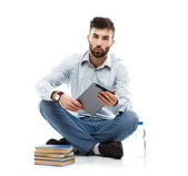 Szczęśliwy Afryki amerykański student z laptopa, książek i bo