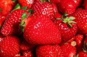 Z góry zbliżenie świeżych dojrzałych truskawek z zielonymi liśćmi jako tłem reprezentującym koncepcję zdrowej żywności