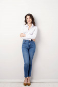 pełna długość szczęśliwa i wytatuowana kobieta z krótkimi włosami i naturalnym makijażem stojąca w białej koszulce i pozująca z rękami w kieszeniach niebieskich dżinsów patrząc na kamerę na szarym tle
